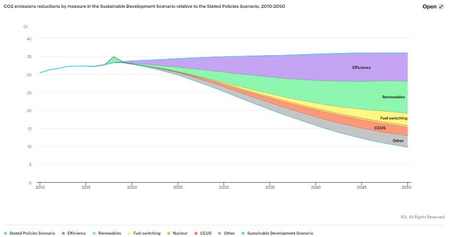 Un graphique issu du rapport "Clean Energy Transitions Programme 2019" de l'Agence Internationale de l'Énergie (AIE) met en lumière le rôle crucial de l'efficacité énergétique. En 2050, pour atteindre les objectifs de développement durable, elle pourrait contribuer à hauteur de 8 gigatonnes (Gt) à la réduction des émissions de CO2. Un chiffre colossal, comparable à celui des énergies renouvelables (9 Gt) et bien supérieur à celui du nucléaire (1 Gt) ou du captage et stockage du carbone (2 Gt).